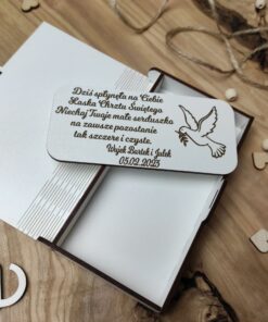 -Podpis na tabliczce, opcjonalnie z datą np: (Wujek Krzysiek z Ciocią Beatą / 05.02.2023)