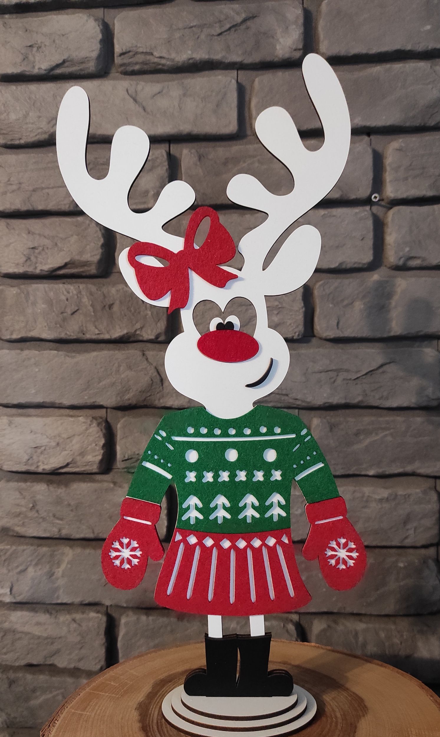 Dekoracja Pani RENIFER w pięknym filcowym sweterku, spódniczce i rękawiczkach będzie wspaniałym uzupełnieniem świątecznego wystroju.