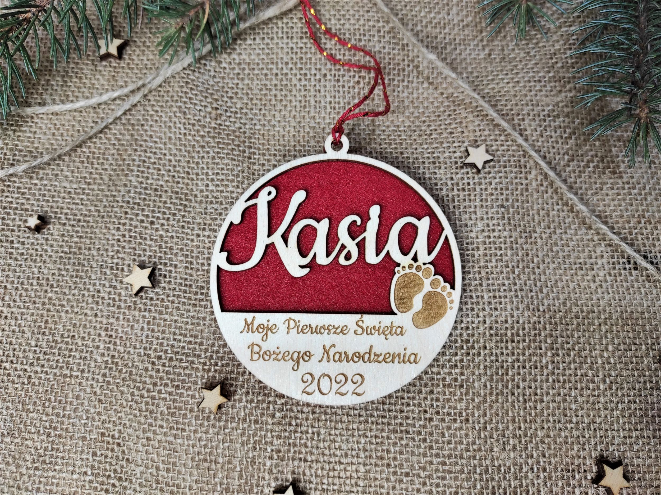 Personalizowana zawieszka dla dziecka które pierwszy raz obchodzi Święta Bożego Narodzenia.